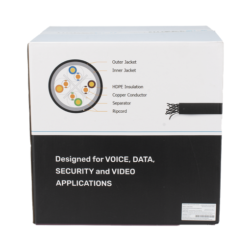 Ver todos los detallesBobina de cable de UTP de 4 pares Cat5e de 305 m (1000 ft), 100% Cobre, LDPE Resistente a rayos UV Relleno de Gel, Color Negro, 24 AWG, Uso en Exterior, Para Aplicaciones de Voz, Datos y Video